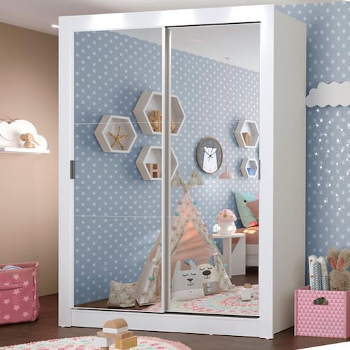 Itens inclusos: - Um (1) cabideiro metálico grande - Duas (2) prateleiras e quatro (4) nichos - Duas (2) portas de correr com espelhos e puxadores em PVC