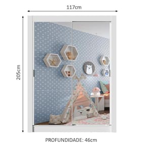 Medidas totais do guarda-roupa: 205 cm de altura x 117 cm de largura x 46 cm de profundidade.