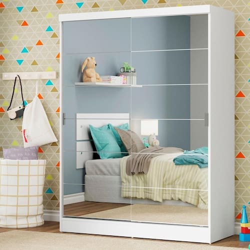 O Guarda-Roupa Infantil Luke da Madesa possui duas portas de correr de espelho que permitem fácil acesso interno, além de não comprometerem a circulação. Os puxadores são em alumínio, resistentes e com formato levemente inclinado, facilitando a abertura.