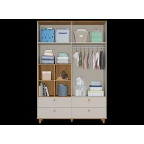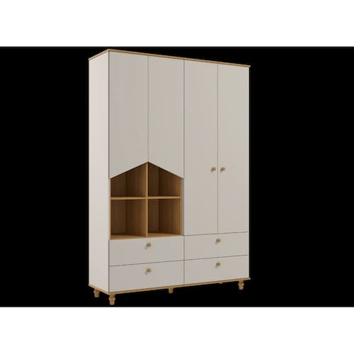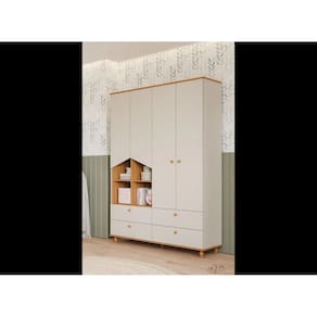 Seguindo o estilo lúdico, esse roupeiro é perfeito para quem deseja um móvel para organizar e, também, decorar. O detalhe fica por conta dos nichos laterais e as portas em formato casinha. Os puxadores e pés são torneados em madeira maciça e conferem um charme especial ao produto. Possui 4 gavetas grandes com corrediças telescópicas que proporcionam deslizamento suave, maior abertura e melhor acesso às roupas. Os nichos laterais podem ser utilizados para objetos decorativos, cestos para organização de brinquedos, livros e etc. Os espaços internos de prateleiras e maleiros são ideais para guardar desde objetos menores até objetos maiores como malas, pacotes de fraldas e caixas ou cestos de organização. Fabricado com matéria-prima 100% MDF, um material ecologicamente correto e de ótima durabilidade e resistência, esse roupeiro é excelente para quem precisa de bastante espaço para organizar tudo com muito carinho.