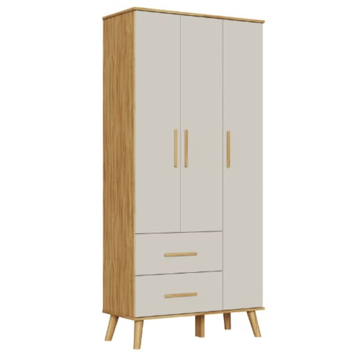 3 portas e 4 gavetas amplas Estrutura firme e durável Puxadores redondos em madeira Opção com ou sem janelas nas portas (ambas na cor Off White com Amêndoa)