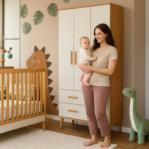 Ambas as variações mantêm a mesma cor e estrutura, oferecendo 3 portas, 4 gavetas com corrediças metálicas e puxadores arredondados em madeira. Ideal para organizar roupas, fraldas, brinquedos e outros itens essenciais do bebê ou da criança.