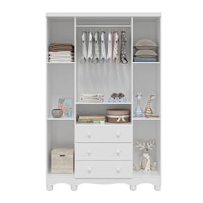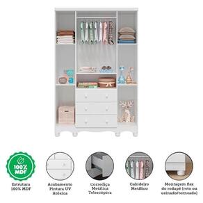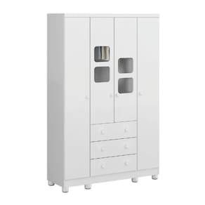 Guarda Roupa Infantil Peroba Uli 4 Portas e 3 Gavetas Cor Branco, referencia ARUL4PP.10 com portas com PETG cristal, puxadores em ABS, cabideiro metálico, 2 opções de rodapé, corrediças telescópicas, 100% MDF e sistema antitombamento. É a combinação perfeita de funcionalidade e estilo, projetado especialmente para atender às necessidades dos mais jovens. Com um design moderno e encantador, ele se destaca pela sua praticidade e beleza, sendo ideal para organizar roupas e acessórios de forma eficiente. Com um design que une funcionalidade e estética, é perfeito para quartos infantis. Seu acabamento em branco proporciona um ambiente iluminado e alegre, enquanto as linhas suaves garantem segurança e conforto para as crianças. O espaço interno é amplamente aproveitado, permitindo que você organize tudo com facilidade. Ele é feito com materiais de alta qualidade, garantindo resistência e durabilidade e um produto que acompanhará o crescimento do seu filho, mantendo-se funcional e bonito ao longo dos anos. As portas e gavetas oferecem um espaço ideal para guardar roupas, brinquedos e outros itens, ajudando a manter o ambiente sempre arrumado. Dessa forma, seu filho poderá aprender desde cedo a importância da organização.