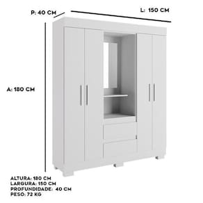 Materiais da estrutura: MDP | Possui Prateleiras: Sim | Peso Suportado: 80 Kg (distribuídos de forma adequada no mesmo) | Sistema de montagem: Convencional (Parafusos, minifix e cavilhas) | Tipo de Corrediças: Telescópicas | Necessita de Montagem: Sim | Tipo de Garantia: Garantia do Fornecedor | Possui Puxadores: Sim | Garantia: 03 meses | Quantidade de Gavetas: 02 | Quantidade de Portas: 04 | Possui Cabideiro: Sim | Possui Portas: Sim | Possui Gavetas: Sim | Peso Suportado por Prateleira: 5 Kg | Marca: Linha Mobília | Altura: 180 Cm | Largura: 150 Cm | Profundidade: 40 Cm | Peso: 72 Kg | Tamanho do Móvel: Casal | Acabamento: Pintura UV (Ultravioleta) | Peso Suportado por Gaveta: 5 Kg | Material dos Cabideiros: Alumínio | Modelo: Portugal | Possui Espelho: Sim | Tipo de produto: Guarda-roupa | Requer montagem: Sim | Inclui manual de montagem: Sim | Quantidade de Prateleiras: 3 Cor: Branco