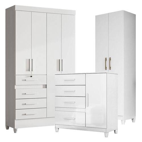 Guarda Roupa Infantil Sobral com Cômoda Vênus com pés e Armário Multiuso New Íris Branco Brilho Moval