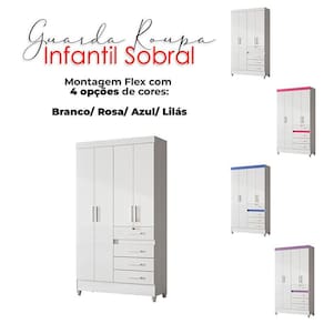 Transforme seu quarto com praticidade, estilo e o melhor custo beneficio do mercado. Apresentamos o Guarda Roupa Infantil Sobral e Armário Multiuso Jade fabricados pela Moval. Guarda Roupa com um inovador sistema flex com quatro opções de cores na hora da montagem: branco/rosa/azul/lilás, possui 04 portas, 04 gavetas sendo a primeira com fechadura e chave ideal para guardar itens pessoais com segurança, corrediças metálicas, puxadores em MDF, cabideiros em alumínio para melhor organização interna e pés em PVC. O Armário Multiuso possui 02 portas, quatro prateleiras internas. Seu diferencial é o gancho metálico multifuncional, ideal para pendurar seus acessórios, otimizando ainda mais o espaço, puxadores na cor bronze, pés em PVC e um design moderno que combina com qualquer decoração. Fabricado com materiais de alta qualidade que garante resistência e durabilidade ao produto. Confira mais detalhes e aproveite!
