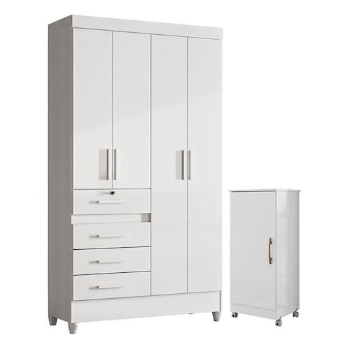 Transforme seu quarto com praticidade, estilo e o melhor custo benefício do mercado. Apresentamos o Guarda Roupa Infantil Sobral e Armário Multiuso Lírio fabricados pela Moval. Guarda Roupa com um inovador sistema flex com quatro opções de cores na hora da montagem: branco/rosa/azul/lilás, possui 04 portas, 04 gavetas sendo a primeira com fechadura e chave ideal para guardar itens pessoais com segurança, corrediças metálicas, puxadores em MDF, cabideiros em alumínio para melhor organização interna e pés em PVC. O Armário Multiuso possui uma porta com puxador na cor bronze, três prateleiras internas com ajustes de altura, proporcionando mais flexibilidade de acordo com sua necessidade, oferecendo um ótimo espaço interno para acomodar vários itens. O diferencial fica por conta dos rodízios, facilitando sua movimentação. Fabricado pela Moval, é desenvolvido em MDP de alta qualidade. Sendo a escolha ideal para quem está buscando praticidade, organização e versatilidade no dia a dia, aproveite!