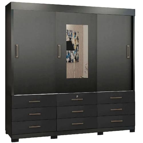 Guarda Roupa Itapema Casal 3 Portas de Correr e 9 Gavetas O Guarda Roupa Casal Itapema 3 Portas de Correr e 9 Gavetas com Espelho Rud Rack tem a característica principal de uso que dispõe de 9 gavetas grandes sendo uma com chave para maior privacidade, tendo acabamento a pintura texturizada dando a sensação real de madeira, o produto por ser porta de correr, tem o maior aproveitamento de espaço. Aproveite!\nMedidas\nAltura 220 cm\nLargura 202 cm\nProfundidade 46 cm\nCaracterísticas\nModelo Guarda Roupa Itapema\nTipo do produto Guarda Roupa\nFabricante Rud Rack\nMaterial MDP/MDF\nTamanho Casal\nPortas 03\nGavetas 09\nPossui Espelho Sim\nTipo de Porta Correr\nPossui Chave Sim, em 01 Gaveta\nAcabamento Pintura UltraVioleta\nTipo de Corrediças Metálicas\nEstilo Moderno\nGarantia 3 meses\nInformações Importantes\nObjetos decorativos que porventura apareçam na foto, não acompanham o produto. Não nos responsabilizamos pela montagem/instalação dos produtos.\nMontagens, desmontagens e instalações são responsabilidades do cliente. Indicamos que contrate uma empresa de montagem ou um montador de sua confiança.\nAlém disso, favor verificar se os pés e acessórios estão dentro do forro inferior do produto. Em suma, todas as informações divulgadas sobre o produto são de responsabilidade do Fabricante.\nAs cores do produto podem variar de acordo com o seu monitor, a iluminação do ambiente em que você está e até mesmo a sua percepção visual. Além da cor, pequenos detalhes e acabamentos podem não ficar evidentes na foto, por isso as imagens são meramente ilustrativas.
