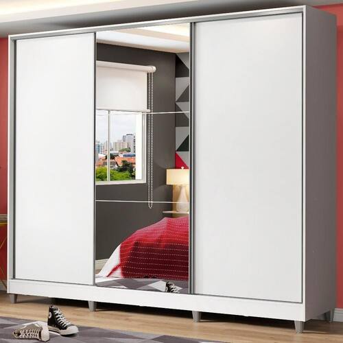 Os tubos cabideiros são em alumínio, muito resistentes e a profundidade do móvel é ideal para qualquer tamanho de cabide. Além disso, o fechamento com duas portas de correr de madeira e uma com espelhos amplia o ambiente e proporciona um ganho de espaço enorme, sem prejudicar a circulação no quarto.