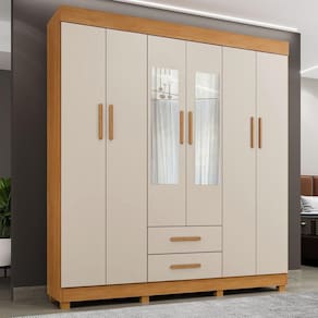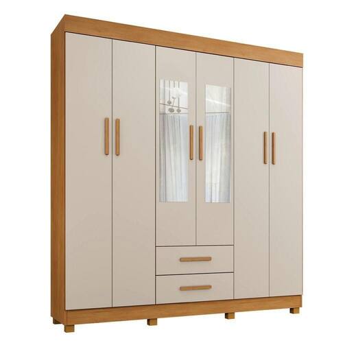 Guarda Roupa Leblon 6 Portas 2 Gavetas 7 Prateleiras Cinamomo Off O Guarda-Roupa Leblon e produzido em chapa de 15 mm que garante robustez e maior vida util , contem 6 portas, 7 prateleiras, 2 gavetas com corredicas telescopica, cabideiro em aluminio, espaco para longos, pes incluso no produto e puxadores modernos , alem de ter espelho nas portas centrais otimo custo beneficio. Sua fabricacao utiliza a linha mdp perffect, que une a sustentabilidade a inovacao tecnologica, proporcionando durabilidade e facil limpeza; inspirando sofisticacao ao mobiliario. Sua pintura UV conta com boa resistencia, e facil de limpar e e ecologicamente correto, pois utiliza madeira de reflorestamento, evitando o desmatamento. Caracteristicas: Material principal: MDP Espessura da chapa: 15 mm Escala de brilho: semibrilho Sistema de montagem: parafuso, cavilha e cantoneiras metalicas Quantidade de Portas: 06 Quantidade de Prateleiras: 07 Quantidade de Gavetas: 02