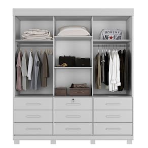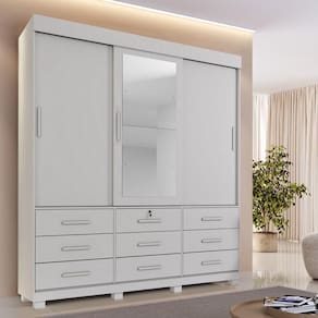 Guarda Roupa Londres 3 Portas 9 Gavetas 4 Prateleiras Branco O Guarda-Roupa Londres e produzido em chapa 15 mm, com 3 portas de correr 1 com espelho e possui trilho aluminio ante queda que garante durabilidade e modernidade, contem 4 prateleiras e 9 gavetas com corredicas telescopicas sendo 1 com chave que proporciona suavidade e melhor durabilidade, com cabideiro e trilho em aluminio moderno e muito util. Sua fabricacao utiliza a linha mdp perffect, que une a sustentabilidade a inovacao tecnologica, proporcionando durabilidade e facil limpeza; inspirando sofisticacao ao mobiliario. Sua pintura UV conta com boa resistencia, e facil de limpar e e ecologicamente correto, pois utiliza madeira de reflorestamento, evitando o desmatamento. Caracteristicas: Material principal: MDP Espessura da chapa: 15 mm Escala de brilho: semibrilho Sistema de montagem: parafuso, cavilha e cantoneiras metalicas