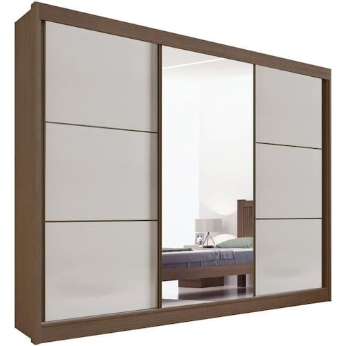 - Portas: Sim, 3, de correr, com um espelho, possui sistema de guia folga zero, roldanas com mola e puxadores em alumínio;
