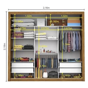 Especificações - medidas produto montado: 218 (a) x 216 (l) x 52 (c) cm; - material: mdp; - acabamento: pintura uv; - possui porta: 3; - tipo de porta: correr; - possui prateleiras: 6 internas; - possui gavetas: 4; - corrediças: metálicas; - possui cabideiro: sim 2;