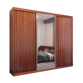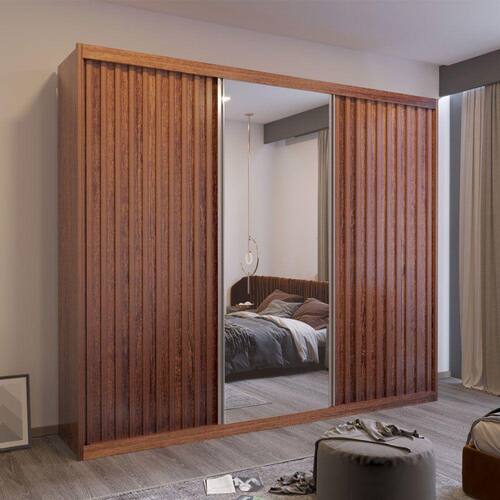 Características: Marca: Bom Pastor Modelo: Maximus Confeccionado em 100 MDF 3 Portas de correr 8 Gavetas com corrediças telescópicas Espaço para roupas longa Trilho inferior em alumínio Colunas laterais -25mm- Espelho com película de segurança Roldanas reguláveis com molas Divisão interna ele/ela