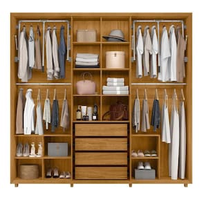 Diferenciais do produto: Acabamento padrão Madetec, Moldura envoltória de 25mm, Dobradiça de 35mm com sistema de amortecimento, Cabideiros extensíveis, Cabideiros de alumínio, Gavetas com corrediças telescópicas, Portas com ripado angular, Puxadores em MDF estilo cava MDF.