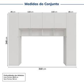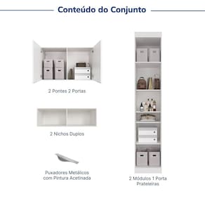 O Guarda Roupa Modulado 6 portas 6 peças Cabeceira Hera CabeCasa foi desenvolvido para trazer a experiência de ter seu móvel customizado de acordo com a necessidade do seu espaço. O conjunto conta com dois módulos de uma porta, duas pontes 2 portas e dois nichos duplos. Com essa proposta, CabeCasa oferece para seus clientes a possibilidade prática e custo-benefício em oferecer uma linha de modulados que faça a função de um móvel planejado. O cliente pode escolher entre os módulos disponíveis, em diferentes variações de acabamentos, os que mais se adaptam ao seu gosto e ao seu dia a dia. Além disso, conta com design moderno que irá trazer muito mais sofisticação e aconchego para a decoração.! Acabamento da Prateleira: Pintura Escala de Brilho da Prateleira: Semi-Fosco Possui Cabideiros: Não Acabamento da Porta: Pintura Escala de Brilho da Porta: Semi-Fosco Material do Puxador da Porta: Metal Altura dos Pés: 11 Altura Máxima dos Pés: 11.0000 Ambiente Principal: Quarto codigo_ean: 7909903824948 Complexidade da Montagem: Alta: deve ser montado por um montador especializado Cor: Branco Geada/Cinza Cor do Produto: Branco Geada/Cinza Cor Interna: Branco Geada Escala de Brilho: Semi-Fosco Itens Inclusos: 02 Guarda Roupas 1 Porta com Prateleiras, 02 Pontes 2 Portas, 2 Nichos Duplos, Manual de montagem e Kit Ferragens Linha ou Coleção: Hera Manual de Montagem e Instalação: https://product-hub-prd.madeiramadeira.com.br/925477/documents/a56d9e27-e751-4bcc-8eb7-9fd40bf0503b2163407489017217565436689.pdf Material da Porta: MDP Material da Prateleira: MDP Material dos Pés: MDF Material Principal: MDP Medida de Cada Item: Guarda Roupa 1 Porta: 45cm x 54cm x 240cm. Ponte 2 Portas: 109cm x 54cm x 68cm. Nicho Duplo: 109cm x 40cm x 34cm modular: Sim Montagem Flex: Por ser modulado pode ser montado de acordo com a preferência do cliente. Necessita Montagem: Sim O Módulo Pode ser utilizado individualmente: Sim Origem do Produto: Nacional Peso: 243,99 kg Peso Máximo por Prateleira: 10 kg Possui Calceiros: Não Possui Espelho: Não Possui Pés: Rodapé Possui Portas: Sim Possui Prateleiras: Sim Produto Montado: Sim Quantidade de Prateleiras: 12 Prateleiras Recomendações de Uso, Manutenção e Limpeza: Deve ser realizada com pano limpo e seco. Sistema de Montagem: Cavilha, Parafuso e Minifix. Tipo de Dobradiça/Corrediça da Porta: Metálica Tipo de Guarda-Roupa: Modulado Casal Tipo de Puxador da Porta: Externo