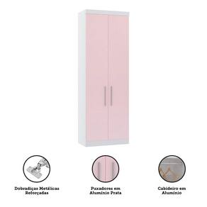 Características: Estrutura: 100 MDP Acabamento: PF Quantidade de Portas: 2 Tipo de Dobradiças: Metálica Reforçada Tipo de Cabideiros: 2 em Alumínio Tipo de Puxador: Alumínio Prata Tipo de Pés: Rodapé Sistema de Montagem: Cavilhas, Parafusos e Minifix Itens Inclusos: 1 Guarda Roupa, Kit ferragens e Manual de Montagem. Garantia: 3 meses