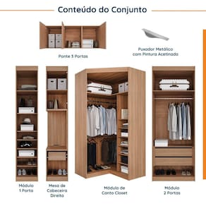 O Guarda Roupa Modulado de Canto 10 portas 5 peças Hera CabeCasa foi desenvolvido para trazer a experiência de ter seu móvel customizado de acordo com a necessidade do seu espaço. O conjunto conta com módulo de uma e duas portas, canto closet, mesa de cabeceira e ponte 3 portas. Acabamento da Prateleira: Finish Foil Escala de Brilho da Prateleira: Semi-Fosco Possui Cabideiros: 05 Acabamento da Gaveta: Finish Foil Escala de Brilho da Gaveta: Semi-Fosco Material do Puxador da Gaveta: Metal Possui Organizador de Gaveta: Não Acabamento da Porta: Finish Foil Escala de Brilho da Porta: Semi-Fosco Material do Puxador da Porta: Metal Acabamento dos Pés: Finish Foil Altura dos Pés: 8 Ambiente Principal: Quarto Complexidade da Montagem: Alta: deve ser montado por um montador especializado Cor: Louro Cor do Produto: Louro Cor Flex: Não Cor Interna: Louro Escala de Brilho: Semi-Fosco Gaveta com Chave: Não Informações Complementares: Portas em chapa de 18mm com dobradiças com amortecimento, gavetas com corrediça telescópica, fundos em 6mm, cabideiros em aço cromado suportando até 10kg e Maleiro até 25kg. Gavetas 3kg / Gaveta Mesa Cabeceira 1,5kg Itens Inclusos: 1 Guarda Roupa 1 Porta, 1 Guarda Roupa 2 Portas, 1 Mesa de Cabeceira Direita, 1 Canto Closet, 1 Ponte 3 Portas, Manual de montagem e Kit ferragens Linha ou Coleção: Hera Manual de Montagem e Instalação: https://cdn2.madeiramadeira.com.br/atributo/herval-moveis-rs/1297216-guarda-roupa-modulado-hera-de-canto-10-portas-e-5-peCas-foto1.pdf Material da Gaveta: MDF/MDP Material da Porta: MDP Material da Prateleira: MDP Material dos Pés: MDP Material Principal: MDP Medida de Cada Item: Guarda Roupa 1 Porta: 240x45x554cm; Guarda Roupa 2 Portas: 240x90x54cm; Mesa de Cabedeira Direita: 240x45x54cm; Canto Closet: 240x119x119cm; Ponte 3 Portas: 68x163,5x54cm. Montagem Flex: As prateleiras podem ser removíveis com diferentes opções de altura, os cabideiros podem ser removíveis e possuem opções para serem utilizado como calceiro ou como cabideiro. Já os gaveteiros possuem duas posições de altura para instalação nos módulos de Necessita Montagem: Sim Origem do Produto: Nacional Peso: 114 Peso Máximo por Gaveta: 1.5 Peso Máximo por Prateleira: 10 Possui Calceiros: Não Possui Espelho: Não Possui Pés: Rodapé Possui Portas: 10 Possui Prateleiras: 12 Recomendações de Uso, Manutenção e Limpeza: Deve ser realizada com pano limpo e seco. Sapatas Niveladoras: Não Sistema de Montagem: Cavilha, parafuso e minifix Tipo de Corrediça da Gaveta: Metálica Telescópica Tipo de Dobradiça/Corrediça da Porta: Metálica Tipo de Gaveta: Interna Tipo de Guarda-Roupa: Modulado Casal Tipo de Puxador da Gaveta: Externo Tipo de Puxador da Porta: Externo