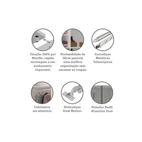 O Guarda Roupa Modulado Prime foi desenvolvido se adequando a vários espaços, de grandes a pequenos. Possui 236 cm de altura oferece divisórias para atender diversas necessidades, profundidade de 111,9cm possibilitando acomodar roupas sem amassar. Produzido em MDP de 15mm, dobradiças Slowmotin reforçadas em 35mm, a montagem é inteira por minifix que proporciona um acabamento impecável e fundos embutidos com perfil usinado para melhor acabamento e maior resistência.