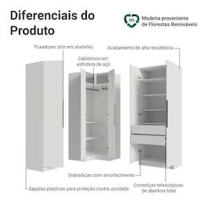 Os diferenciais da linha Neo garantem mais durabilidade no dia a dia: ferragens de alta qualidade, como dobradiças com amortecimento, gavetas com corrediças de abertura total, cabideiros metálicos e puxadores slim em alumínio que completam o design sofisticado. O acabamento branco de alta resistência facilita a combinação com diferentes estilos de decoração.