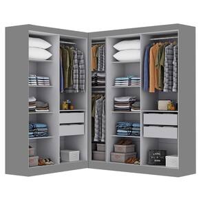 Esta modulação conta com um Canto Paris 4 portas e um Paris 4 portas, ambos com amplo espaço interno, muito bem distribuído com prateleiras para melhor aproveitamento, cabideiro em madeira e uma estrutura versátil que acomoda roupas longas.