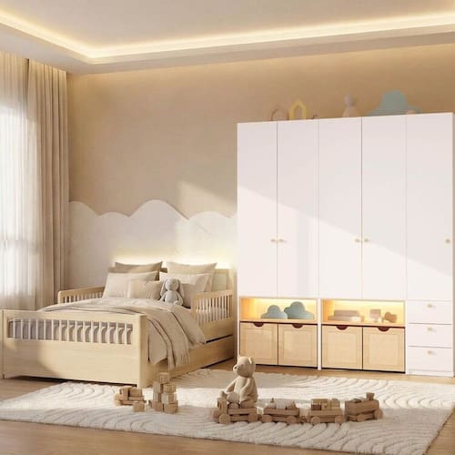 Os guarda-roupas modulados completam o espaço com inteligência, trazendo gavetas telescópicas, nichos iluminados e caixas organizadoras que estimulam a autonomia. A base em madeira natural de pinus, aliada ao branco e ao toque artesanal, cria um refúgio sereno que nutre o desenvolvimento cognitivo. É a combinação perfeita de funcionalidade e inspiração para o crescimento integral.