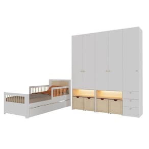 A funcionalidade se destaca na organização inteligente dos guarda-roupas modulados, que contam com gavetas de corrediças telescópicas, prateleiras versáteis e nichos iluminados por LED, criando um cenário mágico para a leitura e o descanso. Detalhes orgânicos em rattan e puxadores em pinus convidam ao toque, enquanto as dobradiças com amortecimento asseguram um manuseio suave e silencioso. Este conjunto não apenas organiza o dormitório com sofisticação, mas transforma o quarto em um refúgio educativo onde a estética escandinava e a pedagogia caminham juntas. É a escolha ideal para famílias que buscam um móvel durável, capaz de nuerir o desenvolvimento cognitivo e emocional em um ambiente minimalista, acolhedor e repleto de personalidade.