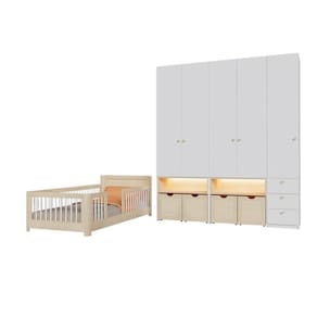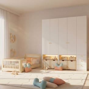 A organização é potencializada pelos guarda-roupas modulados, que seguem a mesma linguagem visual com detalhes em rattan e madeira natural de pinus. Equipados com gavetas telescópicas, dobradiças com amortecimento e nichos iluminados por LED, esses móveis transformam o ato de organizar em uma experiência sensorial e independente. Prateleiras removíveis e caixas organizadoras garantem versatilidade para acompanhar cada fase do crescimento, mantendo o ambiente minimalista, sereno e focado no desenvolvimento integral. É a solução completa para pais que buscam um refúgio de carinho, segurança e inovação pedagógica.
