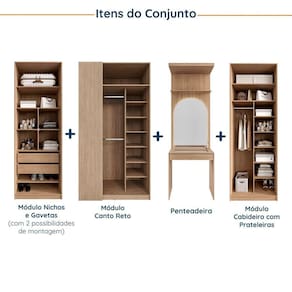 O guarda-roupas Joy CabeCasa foi desenvolvido para trazer a experiência de ter seu guarda-roupas planejado por uma personal organizer. O módulo de canto possui prateleiras reguláveis e removíveis que se adaptam a diversas necessidades. Ele foi pensado para quem precisa de espaço para roupas dobradas, mas não abre mão de manter algumas peças penduradas. Possui montagem flex, podendo ser montado tanto para direita quanto para esquerda. O módulo com Gaveteiro foi desenvolvido para ser versátil e adaptável a sua rotina. Ele foi pensado para quem precisa de espaço para roupas dobradas que podem ser organizadas em seus diversos setores. O modulado possui ainda puxadores em madeira maciça envernizados na cor preta, portas com dobradiças “soft closing” e gavetas com corrediças telescópicas de 45mm. Pensado para quem precisa de um espaço só seu o módulo de Penteadeira possui espaços para organizar perfumes, maquiagens e acessórios, o móvel conta com espelho iluminado a LED e tampo em vidro temperado, para facilitar a organização dos seus acessórios dentro da gaveta sem a necessidade de abri-la. Além disso, tem design atual e alinhado as suas tendências que irão trazer muito mais sofisticação e aconchego para a decoração. Acabamento da Prateleira: Finish Foil Escala de Brilho da Prateleira: Semi-Brilho Possui Cabideiros: Sim Acabamento da Gaveta: Finish Foil Escala de Brilho da Gaveta: Semi-Brilho Possui Organizador de Gaveta: Não Acabamento da Porta: Finish Foil Escala de Brilho da Porta: Semi-Brilho Material do Puxador da Porta: Madeira Maciça Altura do Espelho: 100 cm Ambiente Principal: Quarto codigo_ean: 7909903469323 Complexidade da Montagem: Alta: deve ser montado por um montador especializado Cor: Cinza Cor do Produto: Cinza Escala de Brilho: Semi-Brilho Espessura do Espelho: 3 mm Fita Integrada: Sim Gaveta com Chave: Não Itens Inclusos: 1 Roupeiro de Canto, 1 Roupeiro Nichos com Gavetas, 1 Penteadeira, 1 Roupeiro Cabideiro com Nichos e Manual de Montagem Largura do Espelho: 65 cm Linha ou Coleção: Joy Cabecasa Manual de Montagem e Instalação: https://product-hub-prd.madeiramadeira.com.br/876704/documents/f3062e2b-db3f-4187-b090-1f792cd291e0y04ajoy06amanualdeinstrues.pdf Material da Gaveta: MDP Material da Porta: MDP Material da Prateleira: MDP Material Principal: MDP Medida de Cada Item: Guarda-Roupas Canto: 230 x 119,7 x 61; Guarda-Roupas Nicho com 2 Gavetas: 230 X 80 X 61; Penteadeira: 230 x 77 x 59,5; Guarda-Roupas Cabideiro com Nichos: 230 X 80 X 61; modular: Sim Necessita Montagem: Sim O Módulo Pode ser utilizado individualmente: Sim Origem do Produto: Nacional Peso: 380,9 kg Peso Máximo por Gaveta: 8 kg Peso Máximo por Prateleira: 12 kg Possui Calceiros: Não Possui Espelho: Sim Possui Pés: Não Possui Portas: Sim Possui Prateleiras: Sim Produto Montado: Sim Quantidade de Espelho: 01 Quantidade de Gavetas: 03 Gavetas Quantidade de Prateleiras: 21 Prateleiras Recomendações de Uso, Manutenção e Limpeza: Retire o pó com flanela seca. Sistema de Montagem: Parafuso e Cavilha Tipo de Corrediça da Gaveta: Metálica Telescópica Tipo de Dobradiça/Corrediça da Porta: Metálica Tipo de Fixação do Espelho: Fita Dupla Face Tipo de Gaveta: Interna Tipo de Guarda-Roupa: Modulado Tipo de Madeira Maciça do Puxador da Porta: Pinus Tipo de Puxador da Gaveta: Não Possui Tipo de Puxador da Porta: Externo Ean: 7909903469323