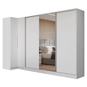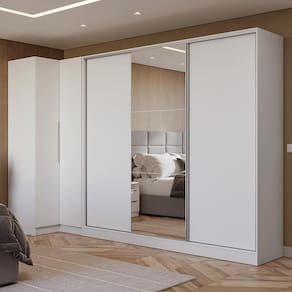 O Guarda-Roupa Royale, por sua vez, é fabricado em 100% em MDF, conta com três portas de correr, sendo uma com espelho que amplia o ambiente e otimiza o espaço. Seu interior é amplo e bem distribuído, com prateleiras, nichos, três cabideiros e quatro gavetas espaçosas, oferecendo capacidade para roupas, acessórios e muito mais.