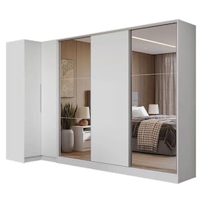 O Guarda-Roupa Royale, por sua vez, é fabricado em 100% em MDF, conta com três portas de correr, sendo duas com espelhos que ampliam o ambiente e otimizam o espaço. Seu interior é amplo e bem distribuído, com prateleiras, nichos, três cabideiros e quatro gavetas espaçosas, oferecendo capacidade para roupas, acessórios e muito mais.
