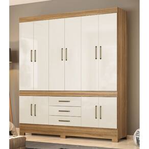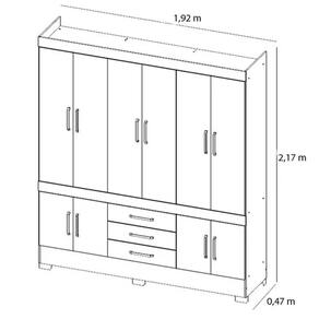 Roupeiro com divisões e compartimento bem distribuídos oferecendo compartimentos exclusivos para vários pares de sapatos, maleiro espaçoso e prateleira. Gavetas externas com deslize perfeito e pés em PVC que facilitam a limpeza do piso ao redor do produto. Puxadores super elegantes na cor bronze.Características:10 Portas3 Gavetas2 PrateleirasCabideirosPés em PVCDimensões:Altura: 217 cmLargura: 192 cmProfundidade: 47 cmPeso: 105 kgVolumes: 2Para garantir a qualidade do produto dentro da embalagem, as caixas são revestidas por um plástico termoencolhível e todas as peças são separadas por isomanta, tudo para preservar e evitar o atrito entre as peças dentro da embalagem. Você contará também com um manual com o passo a passo para auxiliar no momento da sua montagem. Marca: Não Informado