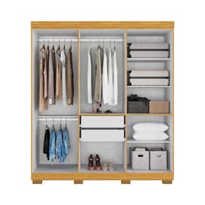 Com um amplo espaço interno, prateleiras, cabideiros em aluminio, além de duas gavetas espaçosas que deslizam suavemente graças às corrediças telescópicas, este guarda-roupa é o parceiro perfeito para manter suas roupas e acessórios organizados com a máxima facilidade.