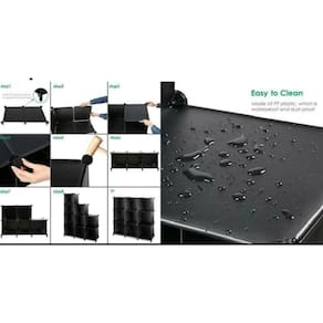Guarda-roupa Portátil com Sapateira, Arara e Prateleiras Guarda Roupa Portatil Com Sapateira Modular Desmontável - Kangur Este armário modular funcional não é só muito elegante como também irá manter as suas roupas e sapatos bem organizados. Vai ser uma grande adição para o seu quarto, sala, corredor ou lavanderia. O guarda-roupa Modular é feito de elementos de plástico e fio de aço cromado, o que o torna facil de limpar. Graças ao seu desenho inteligente, Esse armário pode ser configurado de forma rápida e facil e diferentes configurações , para se adaptar ao seu espaço e humor. Por favor, evite colocar muito nas prateleiras e observe que o plástico é inflamável. Cor: preto e estampado Material: plástico e ferro 15 compartimentos: 8 compartimentos fechados e 7 compartimentos abertos Tamanho de cada compartimento fechado: 35x35cm Peso Bruto 15kg Marca: Kangur Marca: Não Informado Ean: 7905377103398