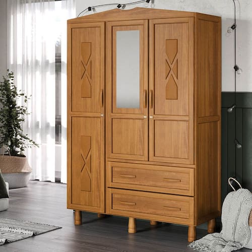 Guarda-Roupa Prático com 3 Portas e 2 Gavetas em Madeira Pinus Carvalho Acetinado - Tozzeto