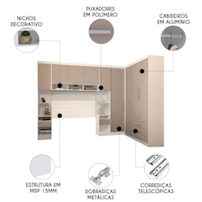 Características do Produto Material da Estrutura: MDP 15mm. Peso Suportado Distribuído: Guarda Roupa 30Kg/Canto Reto 30Kg/Mesa Cabeceira 15Kg cada/Armário Aéreo 15Kg/Sapateira 30Kg. Acabamento: Finish Foil (FF). Escala de Brilho: Fosco. Possui Prateleira: Sim. Quantidade de Prateleiras: 11 Prateleiras. Possui Maleiro: Sim. Possui Nicho: Sim. Quantidade de Nichos: 7 Nichos. Possui Porta: Sim. Quantidade de Portas: 9 Portas. Tipo de Porta: Convencional. Material das Dobradiças: Metal. Possui Espelho: Não. Possui Gaveta: Sim. Quantidade de Gavetas: 6 Gavetas. Tipo das Corrediças: Telescópicas. Possui Puxador: Sim. Material dos Puxadores: Polímero. Possui Cabideiro: Sim. Quantidade de Cabideiros: 1 Cabideiro. Possui Pés: Não. Diferenciais: - Design moderno. - Amplo espaço interno. - Cabideiro em alumínio. - Corrediças telescópicas. - Módulos com rodapé. Sistema de Montagem: Cavilhas/Parafusos/Minifix. Manual de Montagem: Sim. Complexidade da Montagem: Alta. Volumes: 13 Volumes. Conteúdo da Embalagem: 1 Guarda Roupa, 1 Canto Reto, 2 Mesas Cabeceira Alta, Sapateira, 1 Armário Aéreo, 2 Painéis Cabeceira. Garantia do Fabricante: 90 dias contra defeito de fabricação. Montagem: Recomendamos que seja feita por um profissional. Recomendação de Limpeza: Utilize pano úmido.
