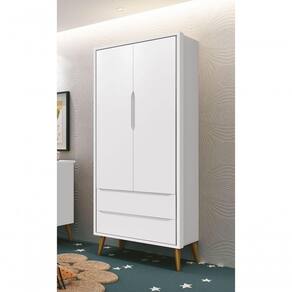 O Guarda-Roupa 2PTs Theo New - MóveisAqui possui um estilo retrô com os pés em madeira maciça no estilo palito, possui um desing clean que combina com vários estilos de decoração. Contempla um espaço amplo e com divisórias internas para que as roupinhas do bebê possam ser organizadas e armazenadas com comodidade, não possui puxadores, as aberturas ocorrem através de recortes no MDF que possibilitam o perfeito encaixe da mão para a abertura das portas e gavetas.