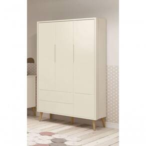 O Guarda-Roupa 3PTs Theo New - MóveisAqui contempla um estilo retrô com os pés em madeira maciça no estilo palito, possui um desing clean que combina com vários estilos de decoração. Proporciona um super espaço para armazenamento e com divisórias internas para que as roupinhas do bebê possam ser organizadas e armazenadas com comodidade, não possui puxadores, as aberturas ocorrem através de recortes no MDF que possibilitam o perfeito encaixe da mão para a abertura das portas e gavetas.