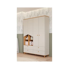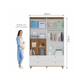 Seguindo o estilo lúdico, esse roupeiro é perfeito para quem deseja um móvel para organizar e, também, decorar. O detalhe fica por conta dos nichos laterais e as portas em formato casinha. Os puxadores e pés são torneados em madeira maciça e conferem um charme especial ao produto. Possui 4 gavetas grandes com corrediças telescópicas que proporcionam deslizamento suave, maior abertura e melhor acesso às roupas. Os nichos laterais podem ser utilizados para objetos decorativos, cestos para organização de brinquedos, livros e etc. Os espaços internos de prateleiras e maleiros são ideais para guardar desde objetos menores até objetos maiores como malas, pacotes de fraldas e caixas ou cestos de organização. Fabricado com matéria-prima 100% MDF, um material ecologicamente correto e de ótima durabilidade e resistência, esse roupeiro é excelente para quem precisa de bastante espaço para organizar tudo com muito carinho. O acabamento de pintura é feito com tinta e verniz UV atóxicos.