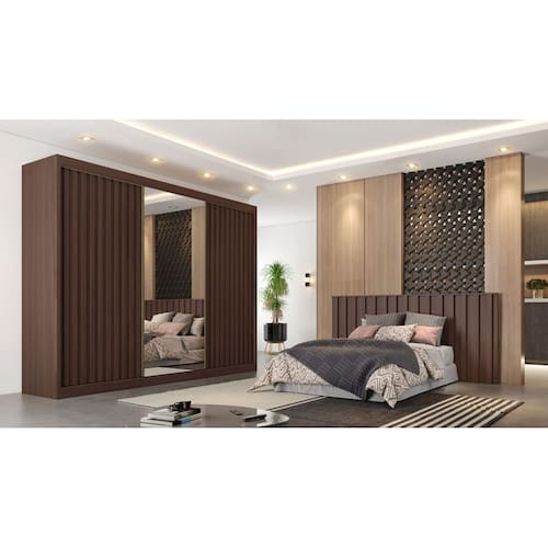 Guarda Roupa Ripado com 3 Portas de Correr e Espelho Central - Athenas-Ipê- Móveis Europa