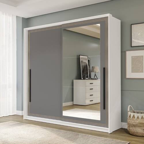 Guarda Roupa Roupeiro 2 portas de correr 2 gavetas com Espelho Valência Branco Cinza Politorno Móveis - Branco | Cinza