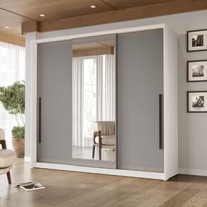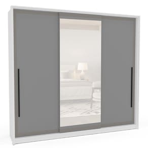 Guarda Roupa Roupeiro 3 portas de correr 4 gavetas com Espelho Valência Branco Cinza Politorno Móveis - Branco | Cinza
