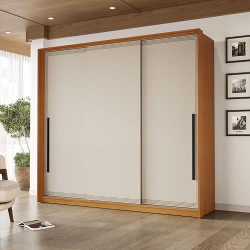 Guarda Roupa Roupeiro 3 portas de correr 4 gavetas Valência Freijó Creme Politorno Móveis - Freijó | Bege