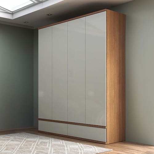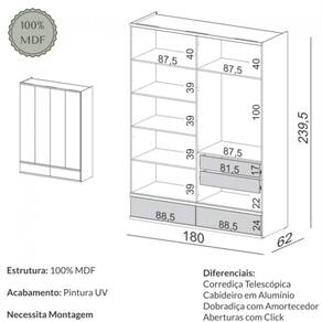 Características: Estrutura 100% MDF Acabamento em Pintura UV 02 Gavetas Internas 02 Gavetas Externas Corrediças Telescópicas Puxadores em Click Cabideiro em Alumínio 04 Portas Articuladas Dobradiças com Amortecedor Prateleiras