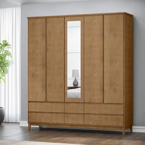 Características: Estrutura em MDF de 15mm Pintura Acetinada Verniz PU e UV 05 Portas Dobradiças Metálicas com Amortecimento 06 Gavetas com Corrediças Telescópicas Portas e Gavetas com Puxador Cava Cabideiro em Alumínio Frentes de Gavetas e Portas em Madeira Maciça Portas em Baixo Relevo com Perfil de Anti-empeno Porta Central Possui Espelho Pés Exclusivos em Madeira Maciça Peso Máximo Suportado pelas Gavetas 05kg Distribuídos Peso Máximo Suportado pelas Prateleiras 10Kg Distribuídos Isolamento de Peças com Manta de Polietileno Expandido (Isomanta)