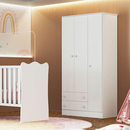 Características Estrutura em MDP Acabamento em Pintura UV Atóxica 03 Portas articuladas 02 Gavetas externas Cabideiro oblongo metálico Dobradiças e corrediças metálicas Puxadores em plástico poliestireno com formato de estrela Acabamento das bordas em perfil PVC Amplo espaço interno com prateleiras Sistema anti-tombamento para evitar riscos de acidentes.
