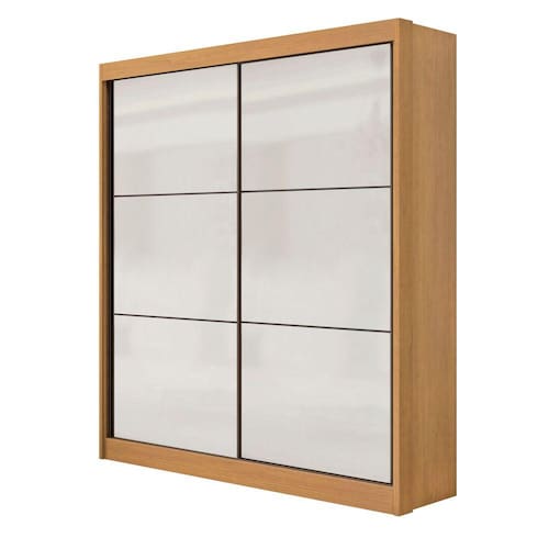 DESCRIÇÃO DO PRODUTO: • 2 portas de correr; • 100% MDF; • Corrediça telescópica 40cm; • Profundidade da gaveta 40cm; • Abertura total da gaveta; • Suporte cabide metálico; • Cabideiro em alumínio; • Puxadores de alumínio; • Produzido com chapa de 15mm e 25mm; • Gavetas com puxador; • Ypê | Off White e Ypê - Dupla face; • 02 opções de montagem; • Roldanas com mola;