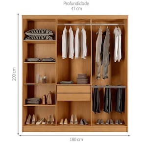 Com estrutura em MDP, ele possui a resistência que você procura em um guarda-roupa para que tenha uma boa duração. E, para manter o visual superbonito por muito tempo, a pintura conta com acabamento em UV e fosco. Os puxadores são produzidos em MDF 25mm e o cabideiro e calceiro em pinus revestido em plástico.
