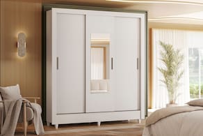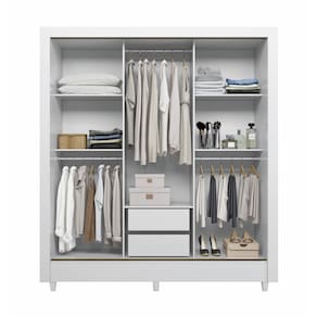 Internamente, o móvel conta com 5 prateleiras, 3 cabideiros em alumínio e 2 gavetas com corrediças metálicas, garantindo praticidade e durabilidade no uso diário. O destaque fica por conta do espelho de cristal 3 mm (1,00 x 35 cm) na porta central, que valoriza ainda mais o visual do quarto.