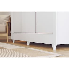 Fabricado em MDP 12 mm com acabamento em verniz brilhante e proteção UV, o roupeiro possui puxadores externos em ABS e pés elevados que facilitam a limpeza. As portas de correr deslizam suavemente sobre trilhos em ABS, otimizando o espaço do ambiente.